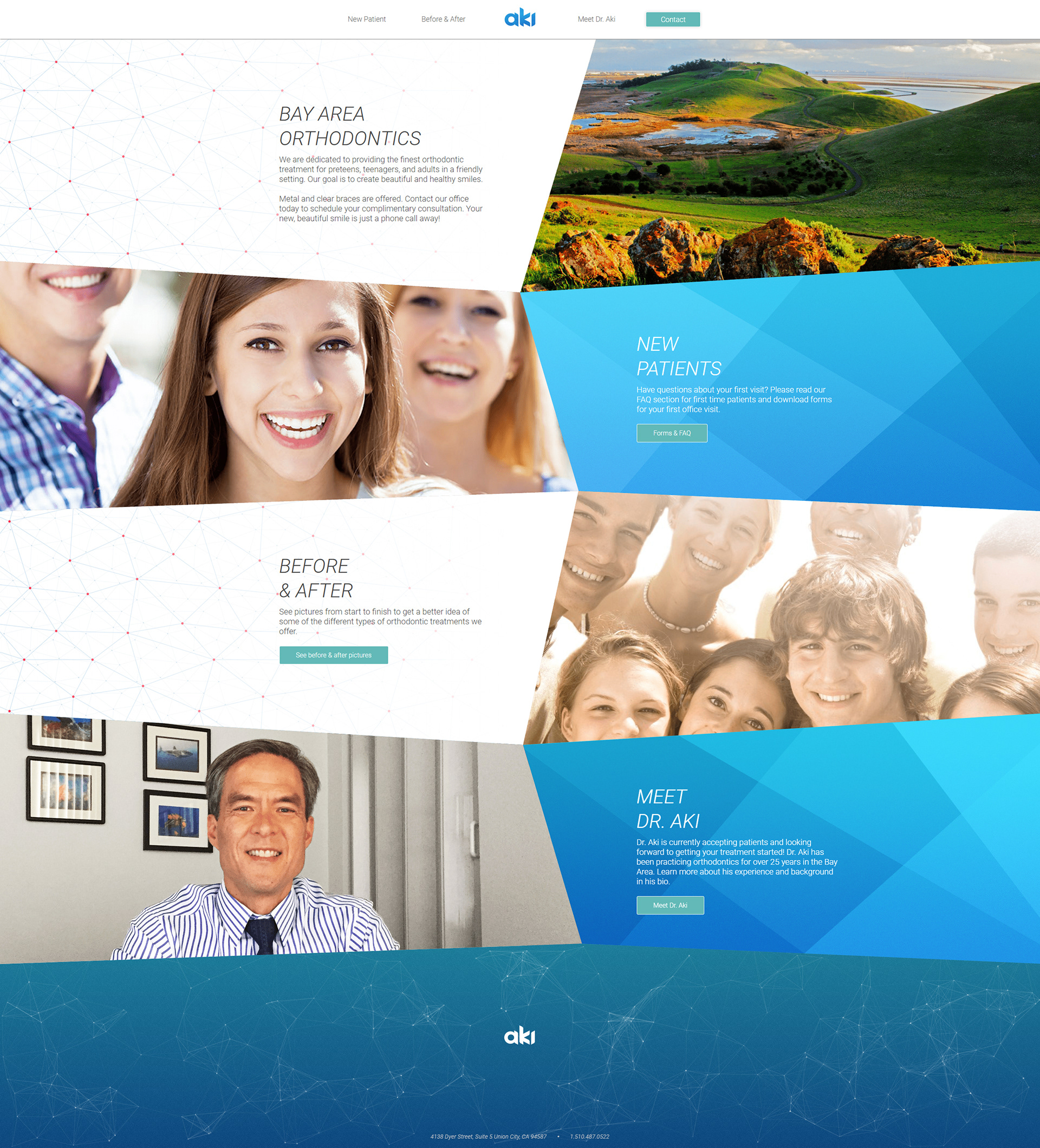 "Aki Orthodontics" is a website I designed and built for San Francisco bay area orthodontist Dr. Aki D.D.S, M.S. Based on Dr. Aki's recommendations, I incorporated local scenery and colors specific to the Union City region of the bay area. Having made the previous version, I designed with mobile readiness and modern web standards in mind while keeping elements of the original website intact.